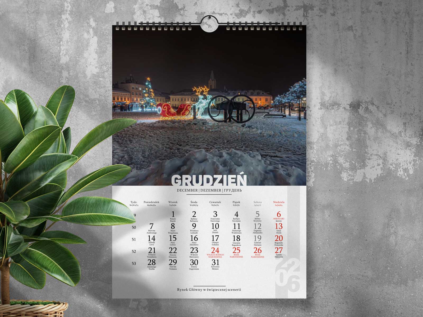 Kalendarz został wydrukowany na papierze kredowym o błyszczącym wykończeniu, co gwarantuje doskonałą jakość zdjęć i trwałość produktu. Format kalendarza to 310 × 440 mm. Publikacja składa się z okładki oraz dwunastu kart miesięcznych, połączonych w całość, tworząc elegancki i praktyczny zestaw na cały rok.